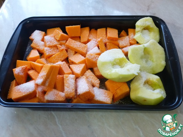 Уложить тыкву и яблоко на противень, посыпать сахаром и запекать в духовке около 40 минут при температуре 180 градусов.