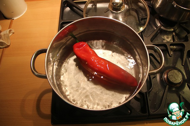 В закипевшую воду опускаем поочерёдно перец на 20-25 секунд, не более, а то будет слишком мягкий