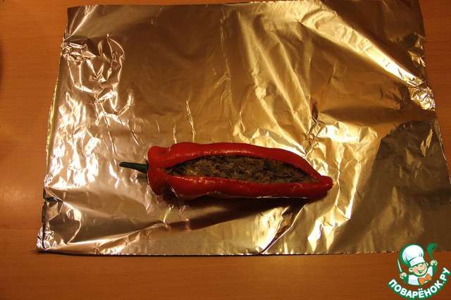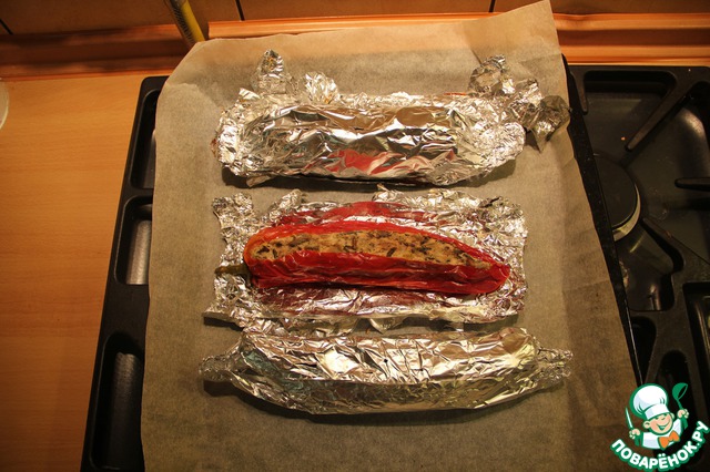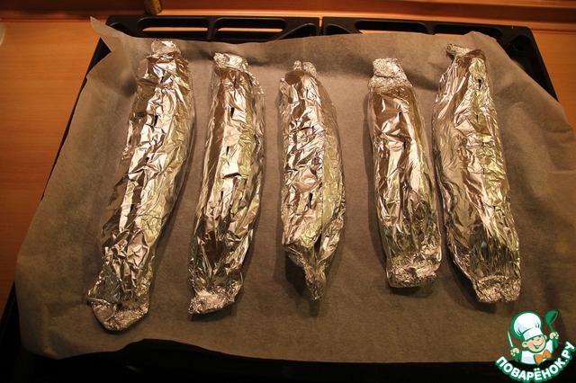 Заворачиваем в фольгу и укладываем на противень начинкой вверх.