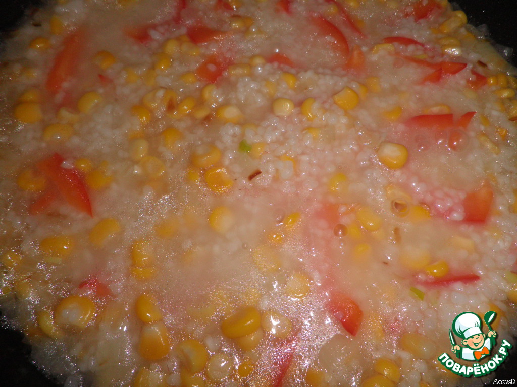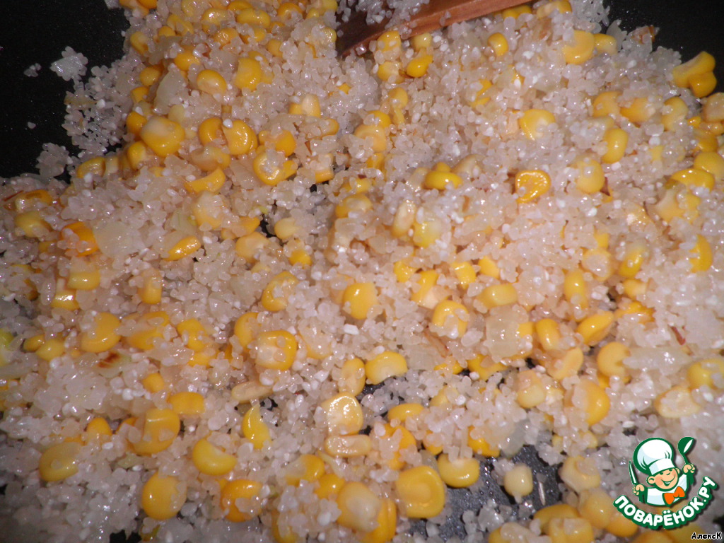 Добавить сладкую кукурузу, рис и жарить, помешивая, около минуты.