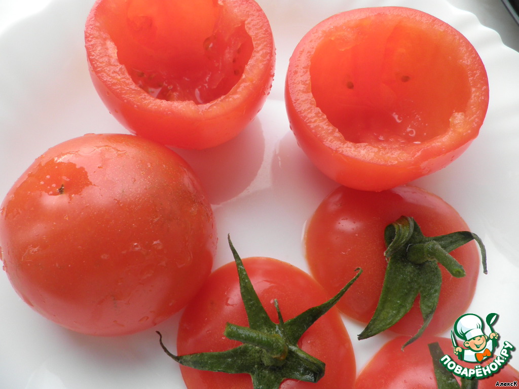Пока готовится основное блюдо, подготовим помидоры. Для этого аккуратно срежем верхушку, скажем так, крышечку. Удалим середину и перевернем помидоры, чтобы стекла лишняя жидкость.