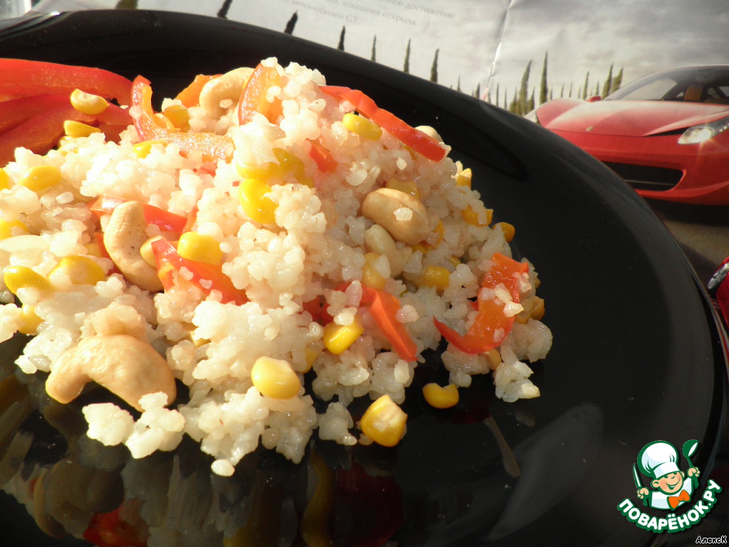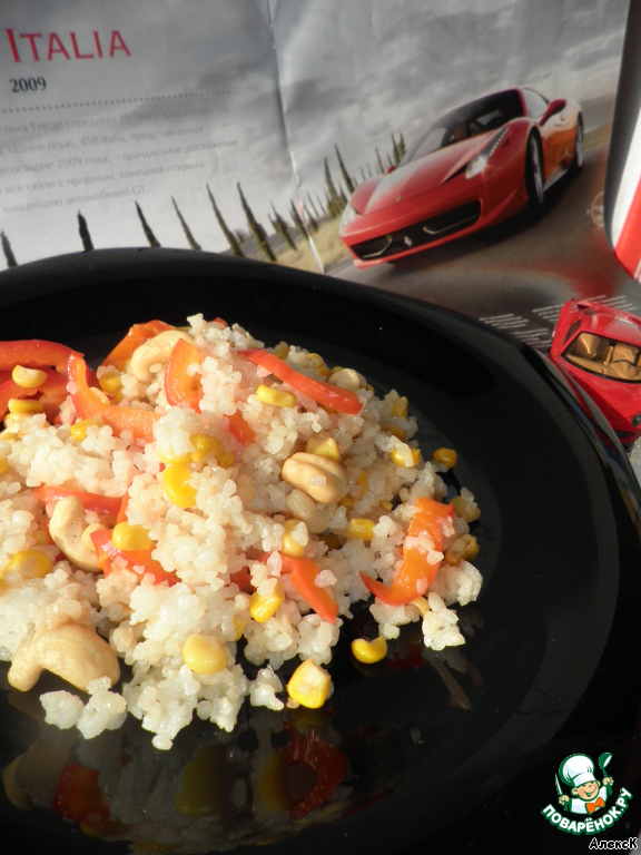 Перец нарезать тонкой соломкой, предварительно удалив сердцевину и семена. Добавить к рису и перемешать.