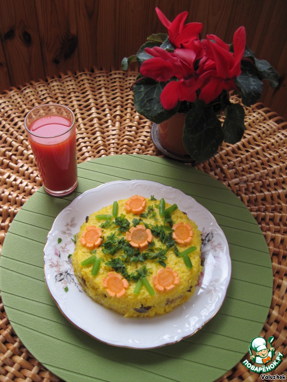 Готовое блюдо украсить на свое усмотрение, я украсила цветочками из моркови и чесночными стрелками, петрушкой