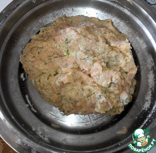 Сделайте фарш из куриного филе и горстки зелени. Зелень нужна только для запаха, поэтому без нее можно обойтись или заменить сухими травками.