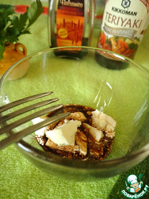 Для заправки смешиваем немного сыра (у меня фета), соевый соус, бальзамический уксус. Разминаем вилкой.