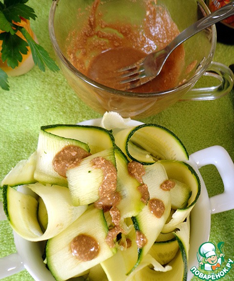 Кабачки сложить в салатник, полить заправкой.