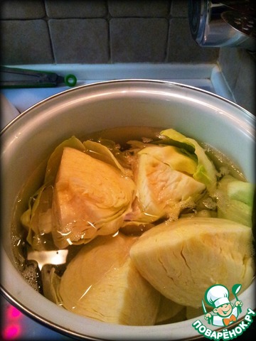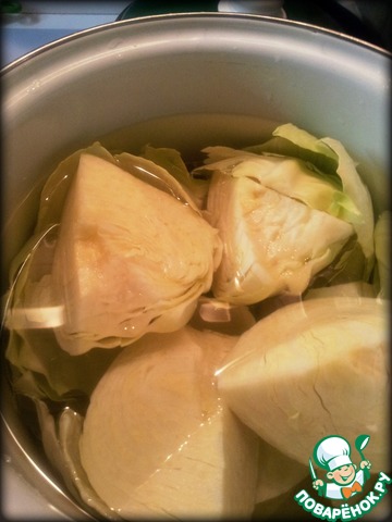 Сначала займёмся начинкой. Для этого нужно очисть капусту от старых листьев, разрезать кочанчик на несколько частей и замочить в холодной воде примерно на под-часика.