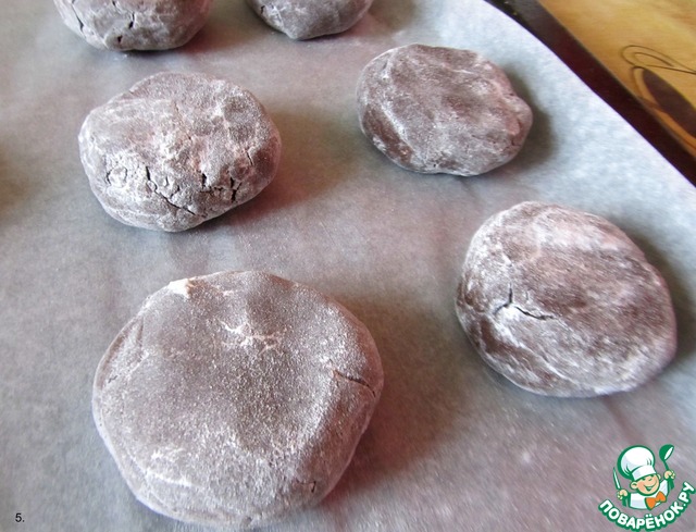 8. Шоколадное "тесто" брать столовой ложкой и выкладывать в сахарную пудру, руками обвалять в пудре, формируя шоколадную массу в шарик, затем взять его в руки, слегка приплюснуть и выложить на подготовленный противень. Сформировать таким способом шайбочки из всего теста и выложить их на противень на расстоянии 3 см друг от друга.