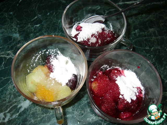 Достаём, добавляем в клубнику+малина 1,5 ч. л. сахара и 1/3 ч. л. крахмала.