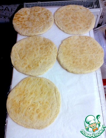 Через полчаса тесто извлечь и, раскатав тонкие коржи по диаметру мультиварки, отправить их выпекаться. Лайфхак для "неукомплектованных" хозяек - вместо скалки для раскатки можно использовать чистую стеклянную тару (например банку 0.5 литра без этикетки).