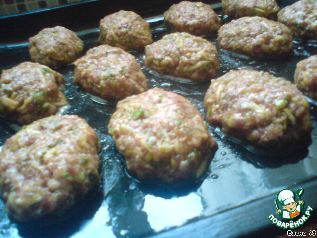 Кабачки натереть на крупной тёрке, добавить фарш, яйца, мелко нарезанную зелень, соль, перец. Всё хорошо перемешать. Сделать котлетки, смазать противень маслом (подсолнечным), выложить их на противень. Выпекать 30 минут.