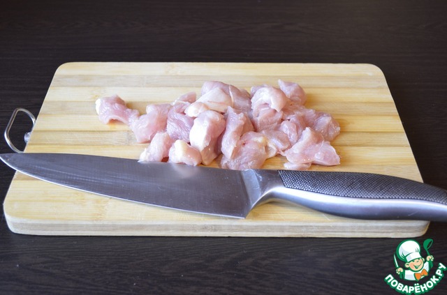 Грудку индейки порезать, выложить в чашу мультиварки.