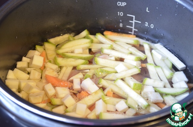 Порезать морковь и кабачок, выложить в чашу мультиварки.
