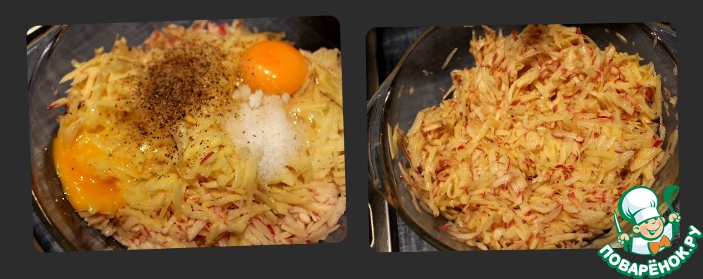Лук и Картофель натереть на терке. Добавить яйцо, соль, перец. Перемешать.