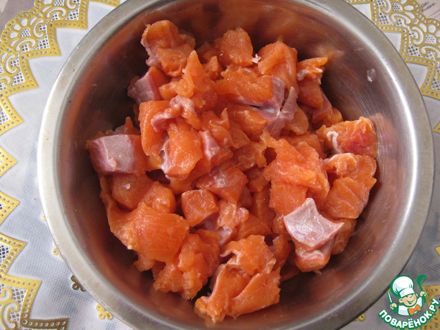 Филе красной рыбы нарезаем мелко.