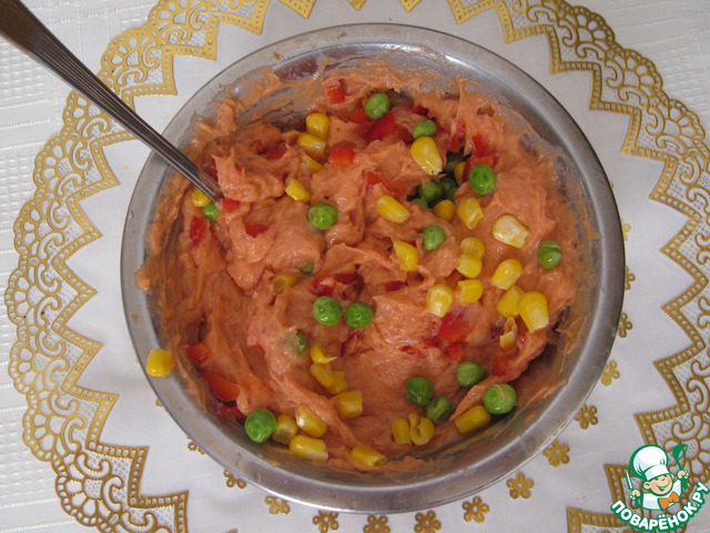 К рыбному пюре добавляем перец, горошек, кукурузу, солим, перчим по вкусу.