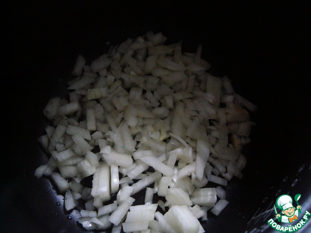 Мультиварку включить на режиме "Жарка" 10 минут. Влить в чашу растительное масло, положить мелко нарезанный лук и обжаривать 2 минуты