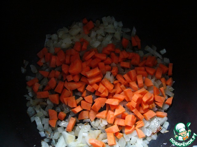 Морковь нарезать небольшими кусочками, добавить к луку и обжаривать ещё 2 минуты