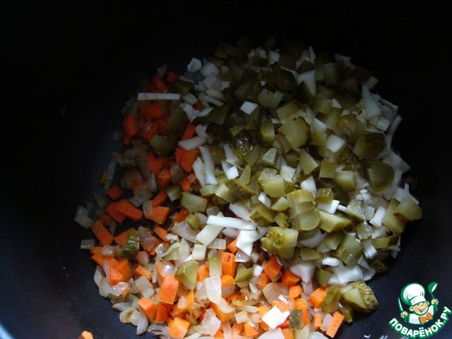 Капусту и солёные огурцы нарезать небольшими кусочками, добавить к луку с морковью и жарить до сигнала