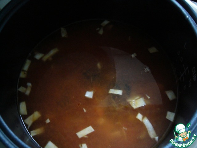 Влить кипяток, добавить соль и перец по вкусу. Включить режим "Суп" 20 минут