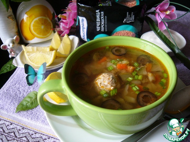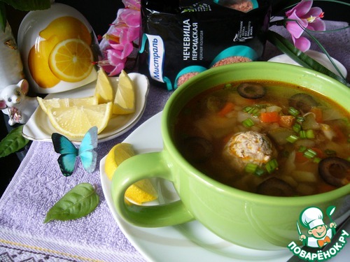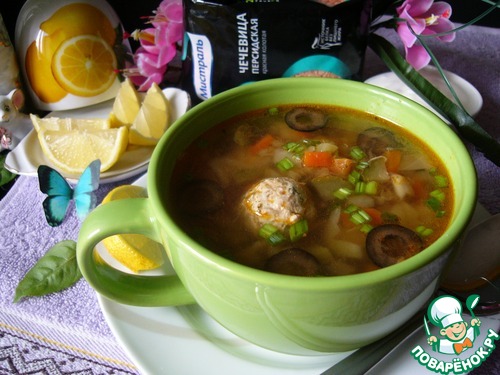 | Облегчённый и обновлённый вариант привычной для всех солянки с чечевицей и фрикадельками из индейки. |