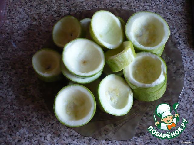 Кабачки нарезать кружками, примерно по 1,5-2 см, вытащить чайной ложкой сердцевину, но не до конца, чтобы получилась чашечка.