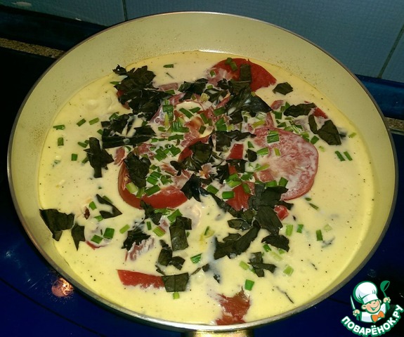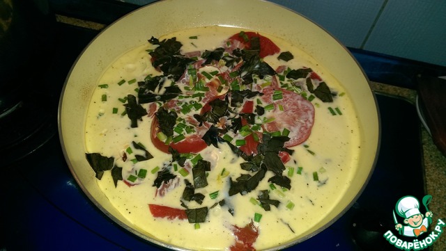Когда помидоры станут мягкими, открыть крышку и выпарить всю жидкость. Приготовим пока заливку для омлета: смешать яйца, сметану, соль и перец. Когда жидкость выпарится, посыпать овощи зеленым луком и базиликом.