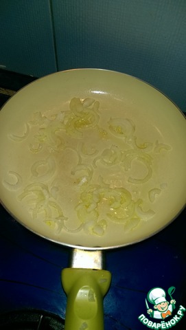 Лук нарезать тонкими полукольцами и обжарить в 1 ст. л. оливкового масла.