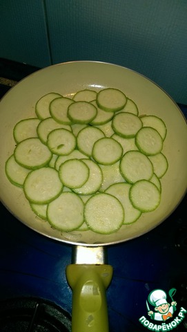 Кабачки нарезать тоненькими (до 3 мм) кружочками, выложить на лук, посолить. Добавить немного воды и протушить под крышкой до мягкости.