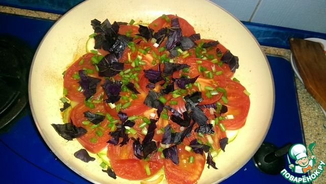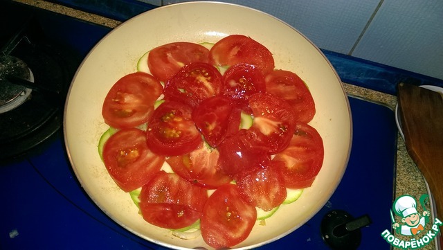 На мягкие кабачки выложить помидоры. И протушить также до мягкости под крышкой.