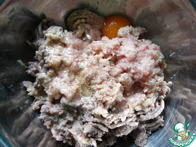 Пропустить через мясорубку куриное бедро, орехи, фасоль, хлеб. Добавить яйцо, соль, перец, приправу. Фарш хорошо перемешать.