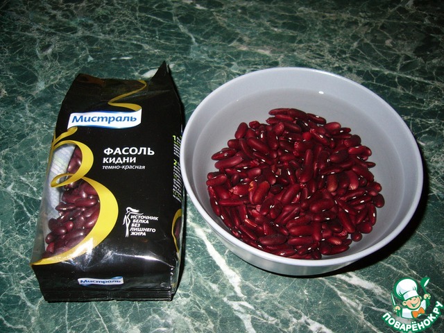 Фасоль Кидни тёмно-красную ТМ"Мистраль"замочить на 3-4 часа, я оставляла на ночь. Утром отварить и откинуть на дуршлаг.
