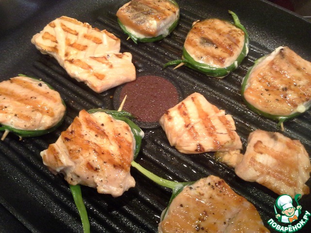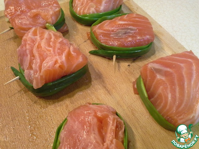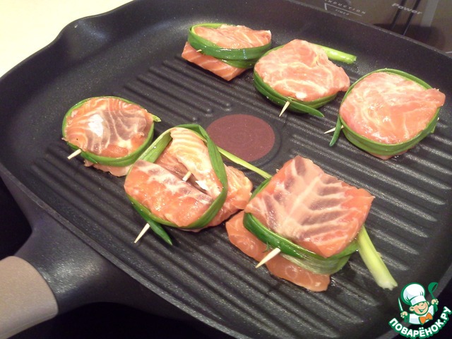 С рыбы снимаем кожу и разрезаем на небольшие куски-медальоны. Чтобы придать кусочкам более круглую форму и чтобы они не развалились при жарке, плотно обматать каждый кусочек пером зеленого лука и закрепить его зубочисткой. Каждый кусочек с одной стороны посолить, поперчить и смазать растительным маслом.