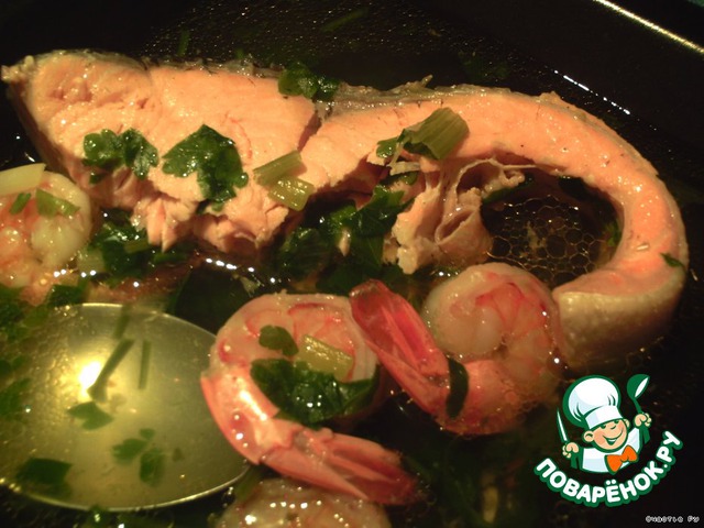 Сразу положить кусок свежей рыбы (лучше от чешуи избавиться) и 12 размороженных королевских креветок.