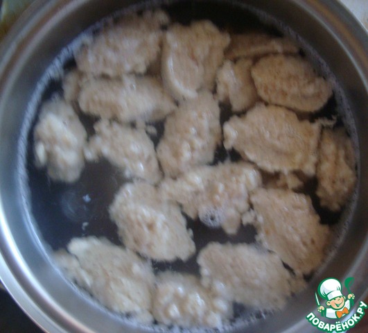 Смоченной в горячей воде ложкой отделять от массы кусочки и опускать в кипящую воду. После всплытия варить пару минут.