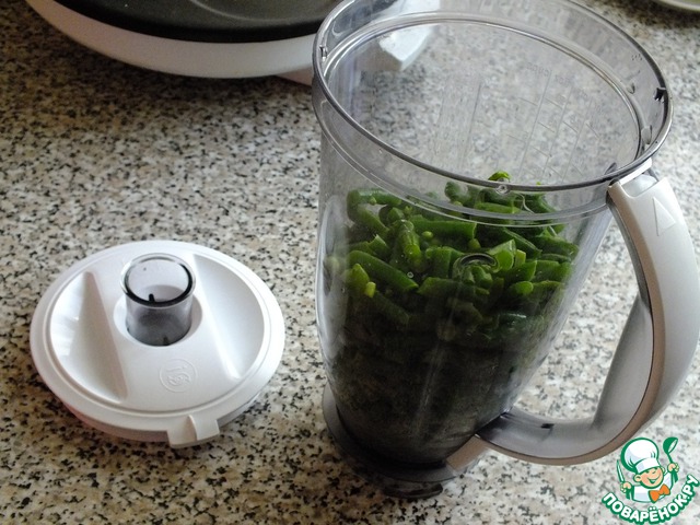 Замороженную стручковую фасоль положить в посуду для микроволновой печи, закрыть крышкой и разморозить - 3,5 минуты на средней мощности в микроволновке.