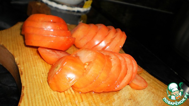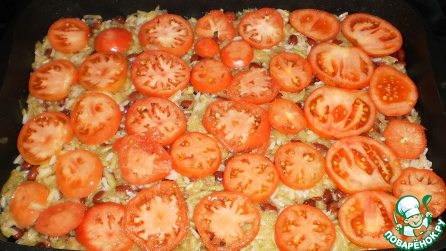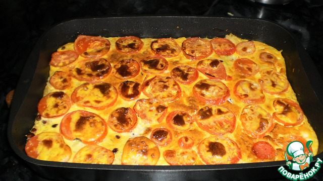 Добавляем помидоры. Заливаем взбитыми яйцами и ставим в духовку на 30 мин. либо до появления золотистой корочки.