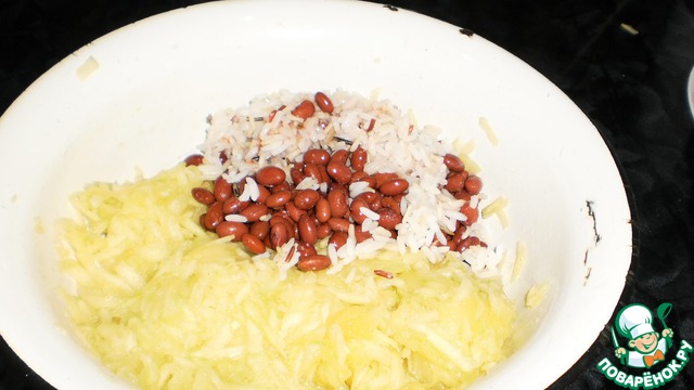 Отжимаем кабачок и смешиваем с фасолью, рисом. Рис у меня был смешанный 4 вида, предварительно отваренный (до полуготовности)