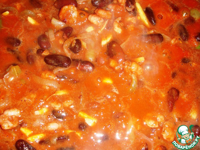 | Очень вкусное, немного острое и пряное рагу. Фасоль великолепно сочетается с морепродуктами и овощами, пропитывается их ароматами. Чили придает легкую остроту, томатный соус - немного кислинки, фасоль - нежный, я бы даже сказала, бархатный вкус, который деликатно подчеркивается корнем имбиря и легкой свежей ноткой сельдерея. Креветки и кальмары в сочетании с фасолью - вообще по-новому играют в блюде. В общем - попробуйте - не пожалеете, очень сытное и вкусное блюдо, которое при этом совершенно не жирное. |