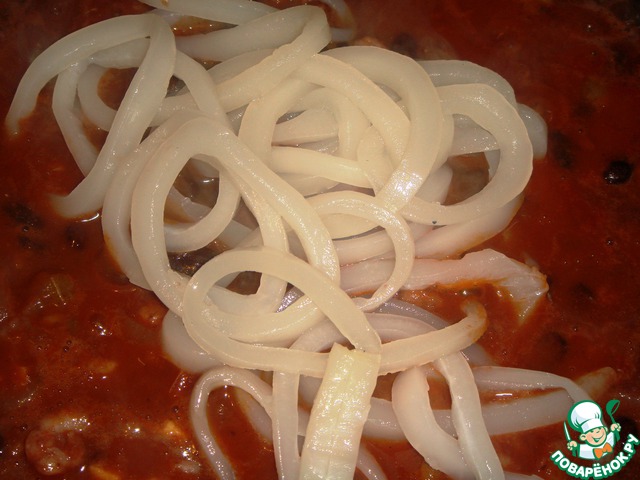 Мои кольца кальмара показались мне толстоватыми, я их разрезала вдоль и добавила к рагу. После этого перемешиваем и тушим еще 3 минуты, солим по вкусу, и можно подавать.