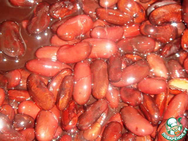 Фасоль промыть водой, добавить на 1 часть фасоли 4 части воды, довести до кипения и варить на медленном огне 2 часа