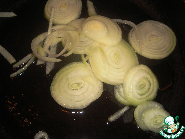 Лук очистить, нарезать кольцами и обжарить на оливковом масле