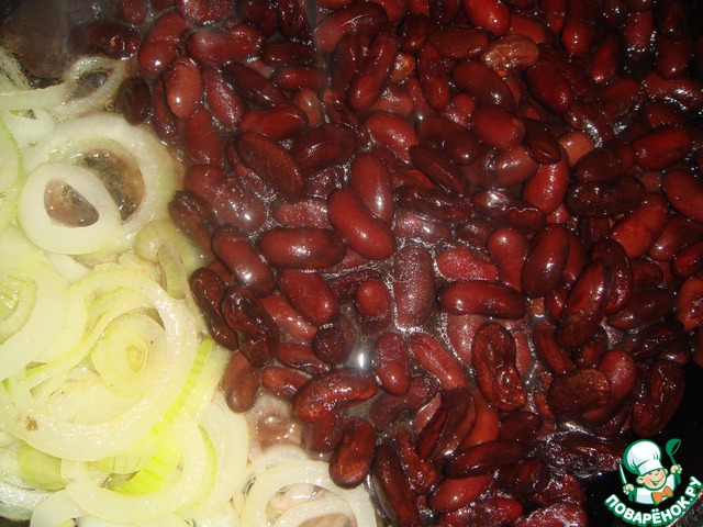 Когда станет мягким, выложить к нему фасоль