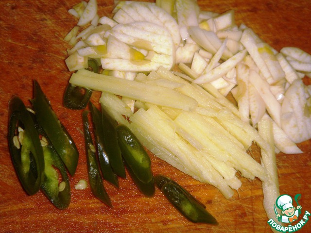 Чили нарезать колечками, чеснок и имбирь - соломкой
