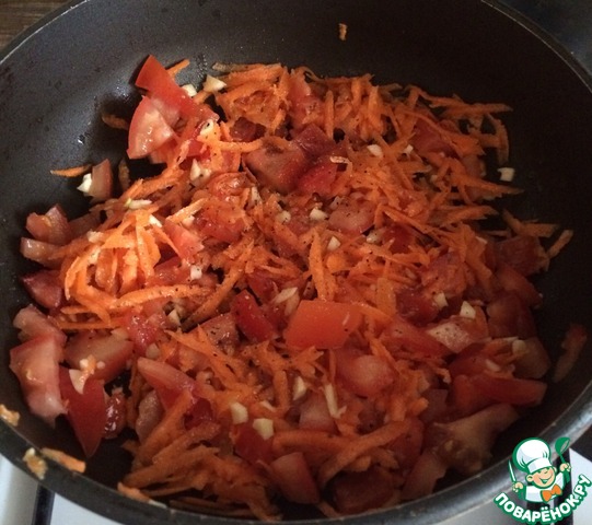 3. На оливковом масле пассируем несколько минут в сковороде чеснок, морковь и помидоры.