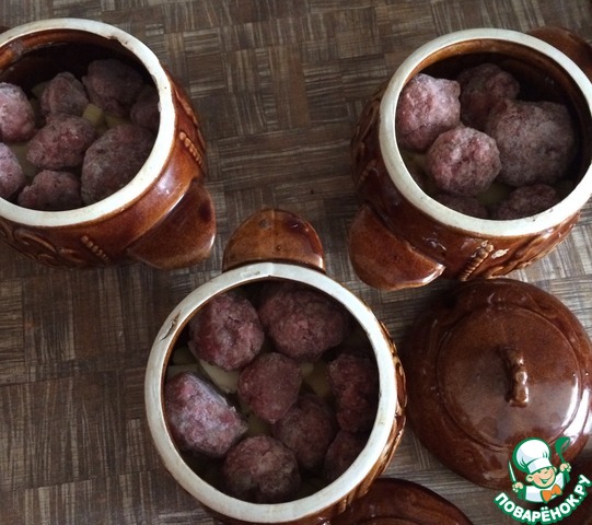 6. Далее раскладываем фрикадельки в горшочки. ( у меня из красного мяса индейки, приготовленные заранее и скучающие в морозилке).