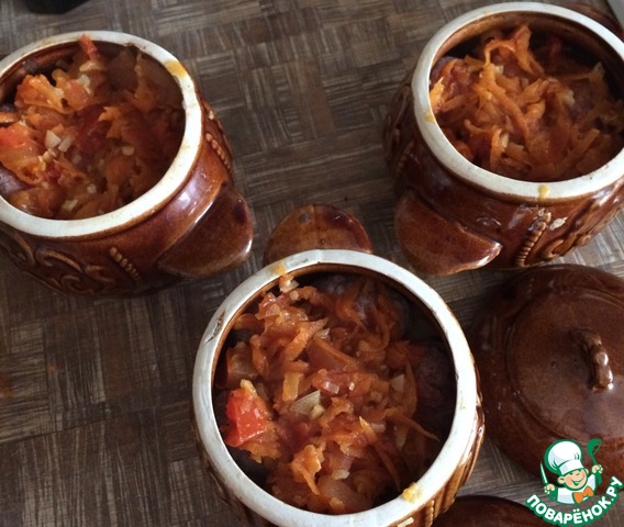 8. Закрываем горшочки крышками и ставим в духовку где- то на 40-50 мин. температура-200 град.