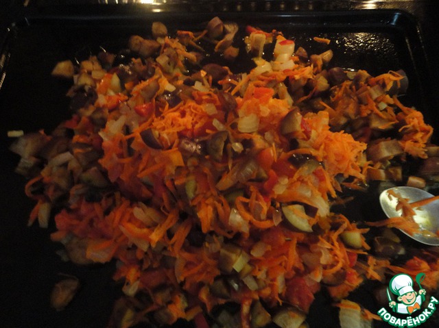 Через 20 мин. перемешиваем и второй раз ещё через 20 мин. Все овощи растаяли. Раскладываем ровным слоем и ещё 20 минуток в духовке. В это время чистим картошечку и в кипящую воду, варим до готовности.