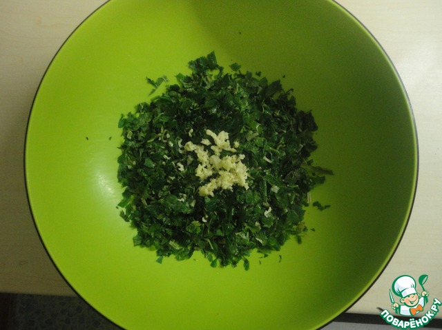 Выкладываем в удобную ёмкость кинзу (у меня она тоже замороженная, так же как и укроп), любая зелень, какую вы любите, выдавливаем чесночок, перчим.