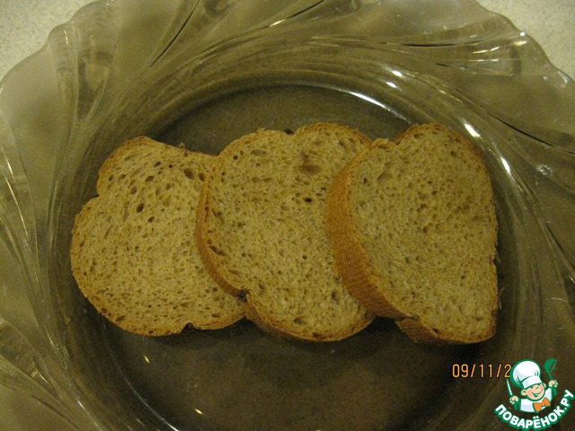 Ржаной хлеб нарезаем тонкими ломтиками. Желающие могут поджарить гренки или тосты.